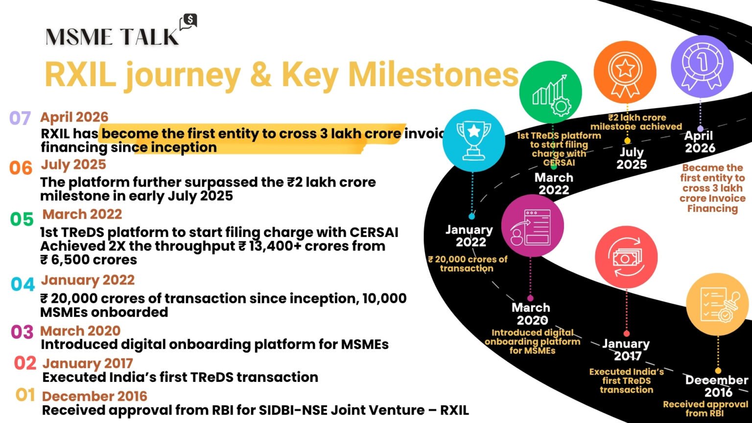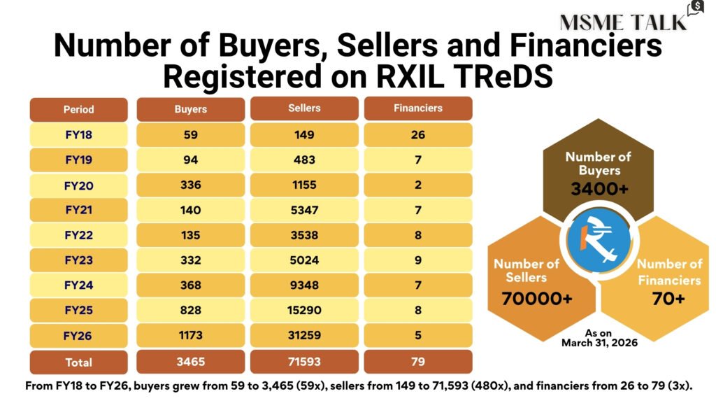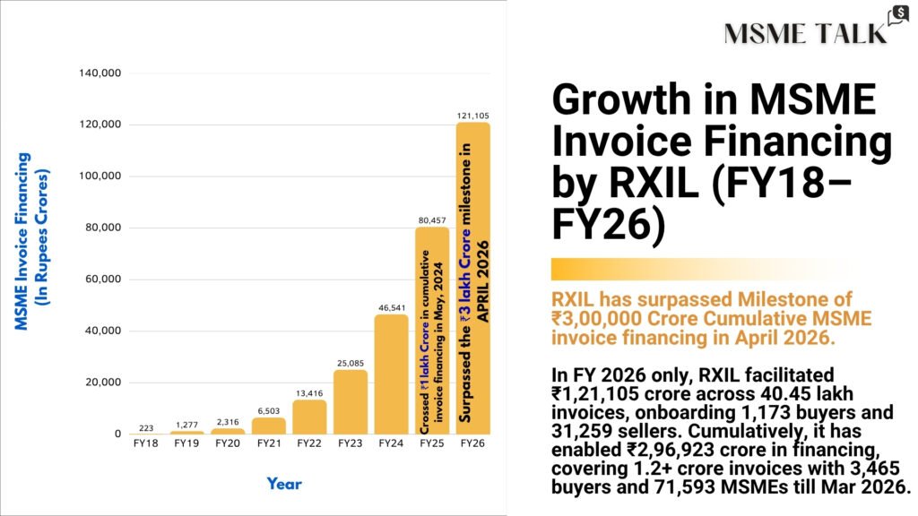 By April 2026, RXIL has become the first entity to facilitate over ₹3 lakh crore in invoice financing, supporting over 71,500+ MSMEs and connecting 3,400+ buyers with 70+ financiers.