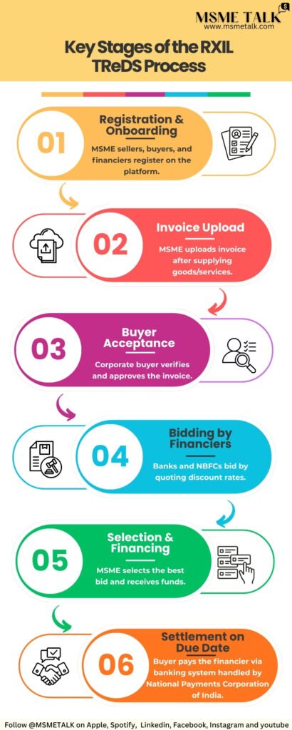 The TReDS mechanism operates through a structured digital workflow that connects MSME sellers, corporate buyers, and financiers on a single platform.